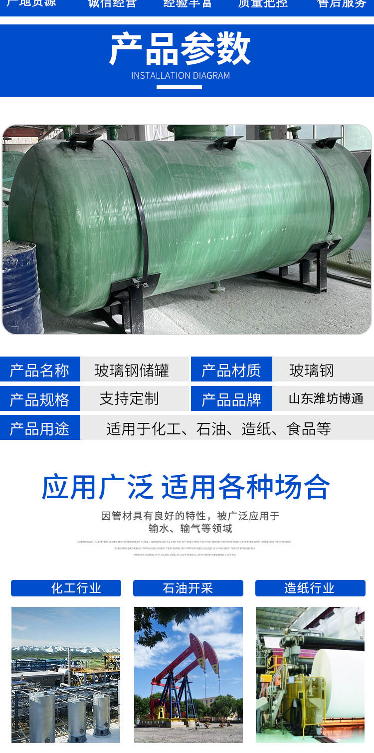 山東環通復合材料有限公司成立于2011年,是從事玻璃鋼儲罐產品的企業,公司位于山東濰坊安丘市。玻璃鋼儲罐分為:立式儲罐和臥式儲罐,有1立方、2立方3立方、4立方、5立方、10立方、12立方、15立方、20立方、25立方、30立方、50立方等,顏色分為:綠色、藍色、黃色等。公司產品主要分為:玻璃鋼儲罐容器,玻璃鋼化糞池,玻璃鋼隔油池,玻璃鋼加砂管道,玻璃鋼脫硫塔,玻璃鋼格柵,玻璃鋼防腐,玻璃鋼儲罐,玻璃鋼管件等。